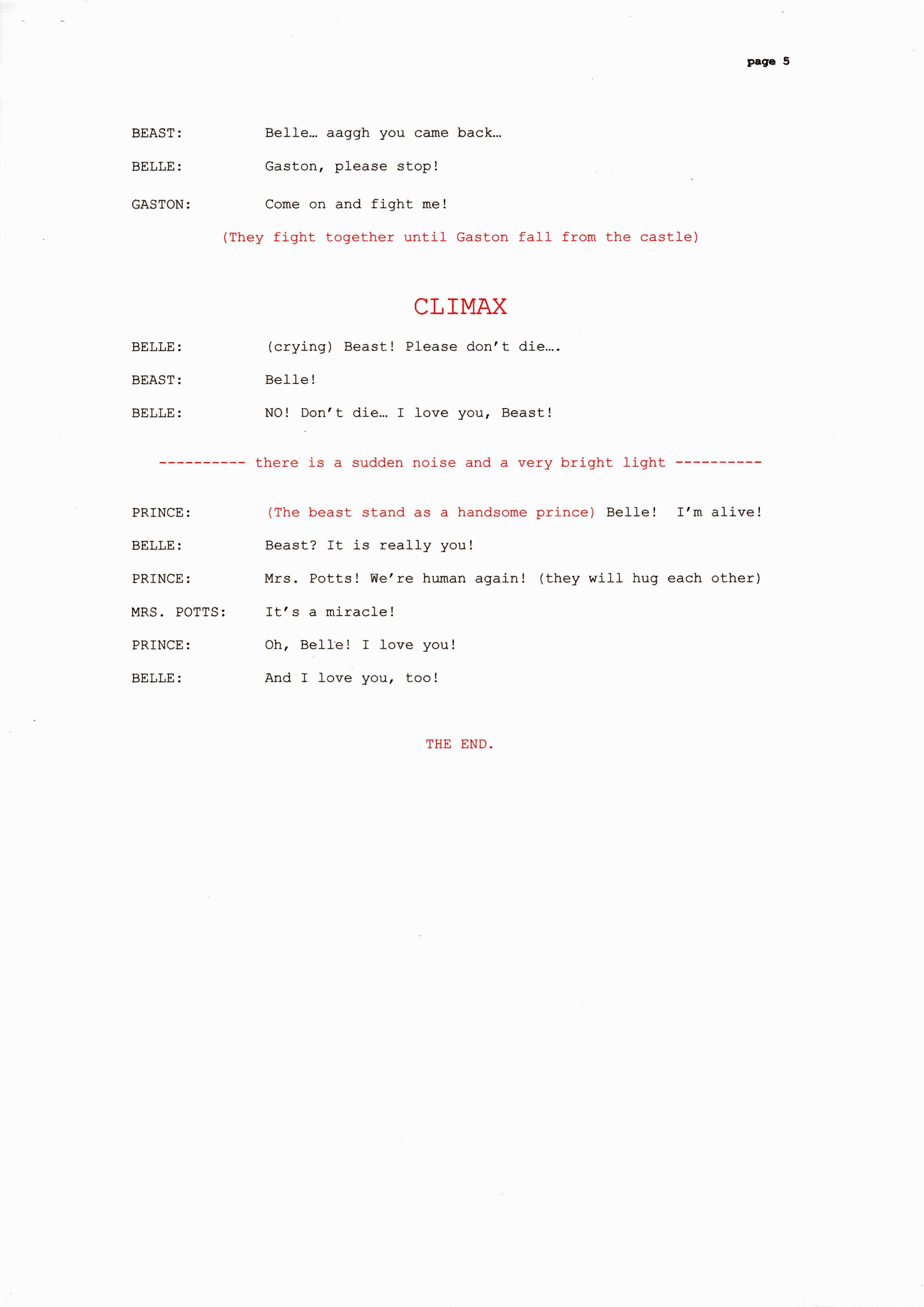 BELLE: Oh! What a beautiful day! Good morning everyone! GASTON: (pointing to BELLE) She’s the one I’m going to marry.