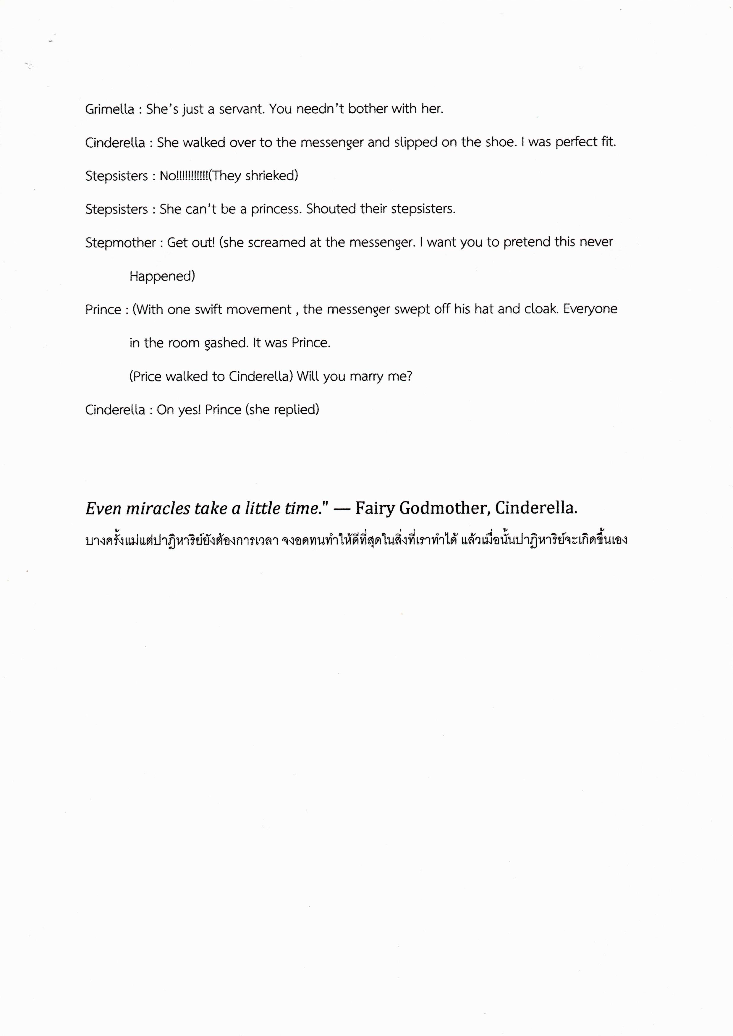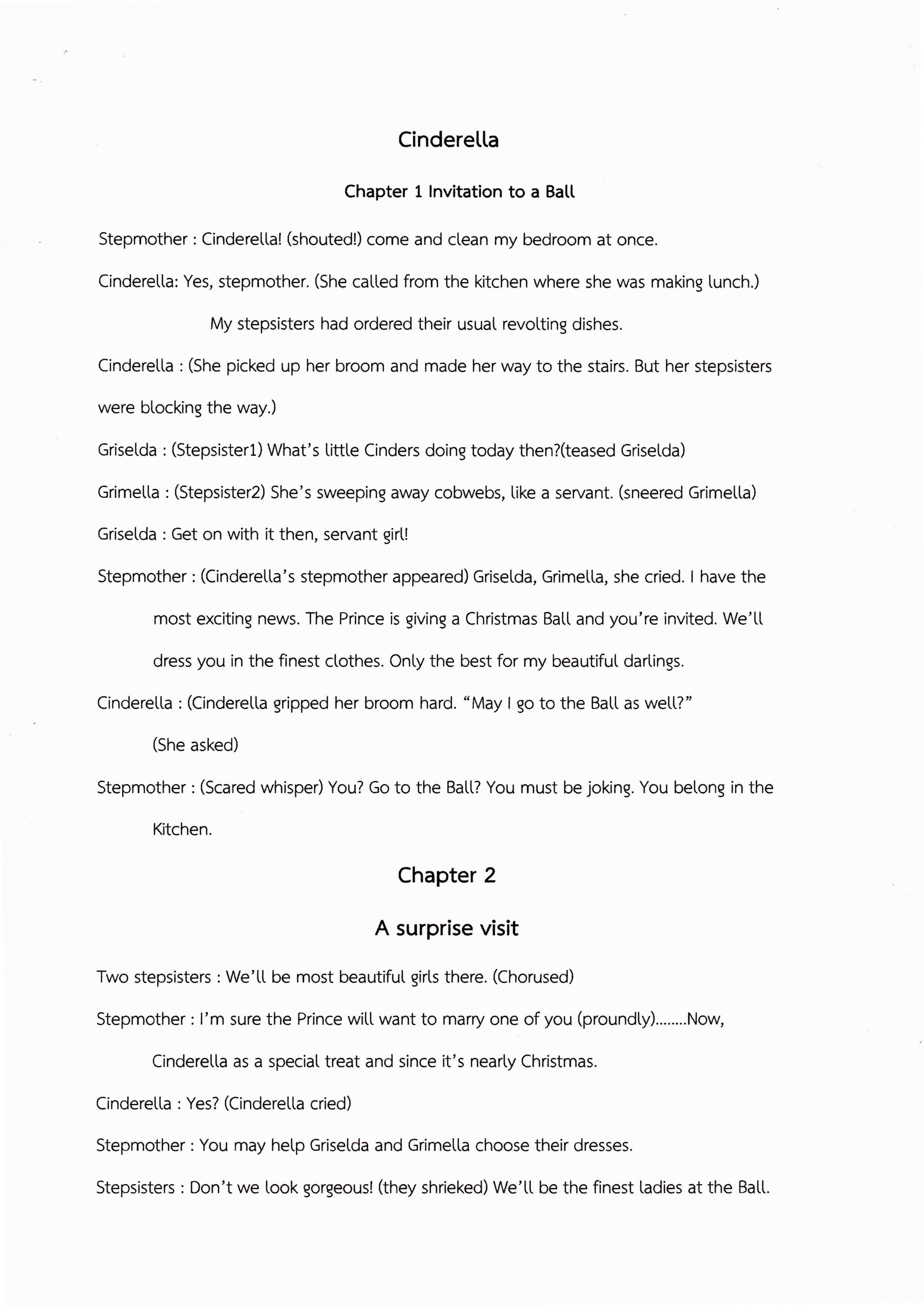 Stepmother : Cinderella! (shouted!) come and dean my bedroom at once. Cinderella: Yes, stepmother. (She called from the kitchen where she was making lunch.) My stepsisters had ordered their usual revolting dishes.