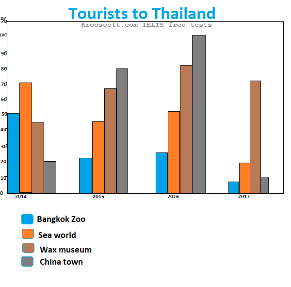 The bar graph shows the proportion of tourists to Thailand who had visited Bangkok zoo, Sea world, wax museum and China town in Bangkok between 2014 and 2017. Wax museum was clearly the most popular among all tourists to Thailand while the Bangkok zoo had the least number of visitors. In 2014, 50 percent of all tourists visiting Thailand went to the Bangkok zoo. Between 2014 and 2017 there was a dramatic decrease in the numbers. In 2015 and 2016 less than 25 percent of all tourists went to the zoo. It further fell to under 10 percent by 2017.