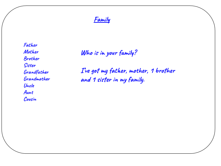 If you need to further simplify this lesson to suit absolute beginners or novices, use flashcards or picture cards for family. I highly recommend using pinterest.com to find flashcards. You can present each flashcard and elicit the word. It is a very effective teaching method. It works great with Asian students from China, Thailand and immigrant kids from these countries in USA or Canada. Since they have no prior experience of the language, pictures work well. Choose colorful and exciting flashcards that students can relate to.